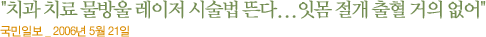 드드드득……. 치과 치료를 받다보면 마치 콘트크리트벽을 뚫을 때 같은 소리가 들리곤 한다. 이 소리가 무서워 치과에 가지 않겠다는 사람들이 꽤 많았다. 최근 새롭게 등장한 치과용 의료기기 ‘물방울 레이저’는 환자들의 이런 두려움을 깨끗이 잠재워주고 있다. 주로 개원가를 중심으로 많이 활용돼 왔던 이 물방울 레이저를 대학병원들도 잇따라 도입할 만큼 환자들의 반응이 좋다. 한림의대 강동성심병원이 지난해 5월, 경희의료원 치과병원이 올 3월 도입한 데 이어 서울대 치과병원과 연세의료원 치과병원도 도입을 검토중이다. 물방울 레이저는 일반 레이저와 달리 레이저 에너지를 흡수한 물방울의 힘으로 치아나 잇몸 등을 절삭, 절개하고 치료한다. 레이저 자체가 갖는 마취 효과와 물방울의 지혈 효과로 인해 통증과 출혈이 거의 없는 것이 장점. 또 드릴 등 기존 치료기와 달리 진동에 의한 미세한 치아 균열도 생기지 않는다. 때문에 환자들이 공포감없이 심리적으로 안정된 상태에서 시술받을 수 있다. 임플란트(인공치아 이식), 잇몸성형, 충치 및 시린이 치료, 스케일링 등 거의 모든 치과 진료에 활용 가능하다. 한림의대 강동성심병원 치과 박준우 교수는 “지난해 10월부터 일반 레이저와 물방울 레이저로 임플란트 수술을 받은 12명의 남녀 환자를 조사한 결과, 응답자 모두 임플란트 수술 중 혹은 수술후 24시간이 지나서도 통증을 느끼지 못한 것으로 나타났다”고 말했다. 물방울 레이저는 특히 임플란트 시술이 어려운 당뇨나 고혈압 환자들도 안심하고 시술받을 수 있다. 경희의료원 치과병원 보존과 박상혁 교수는 “당뇨 환자는 치주염 발생 위험이 정상인보다 3배 정도 높은데, 물방울 레이저가 갖는 자체의 살균력으로 임플란트 이식시 일어날 수 있는 2차 감염을 방지할 수 있다”고 말했다. 또 “마취 주사를 따로 놓지 않기 때문에 고혈압 환자의 경우 마취 주사액으로 인한 혈압 상승을 걱정하지 않아도 된다”고 덧붙였다.